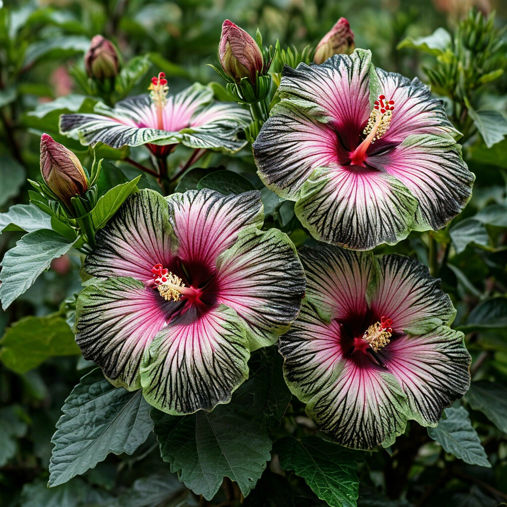 - Белые лепестки с розовой сердцевиной и черными прожилками: главная особенность этого сорта — его утонченная и неповторимая окраска. Цветки гибискуса “Амбер Лайт” имеют чистые белые лепестки, которые создают эффект воздушности и легкости. Нежная розовая сердцевина добавляет цветку тепла и трогательности. Тонкие черные прожилки, словно изящное кружево, придают цветку графичность и оригинальность.